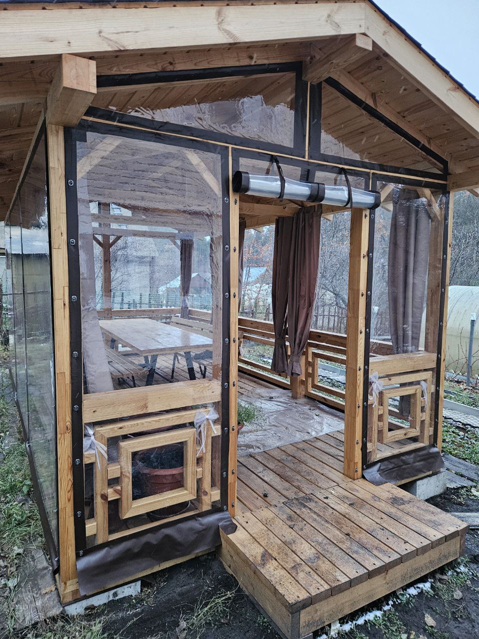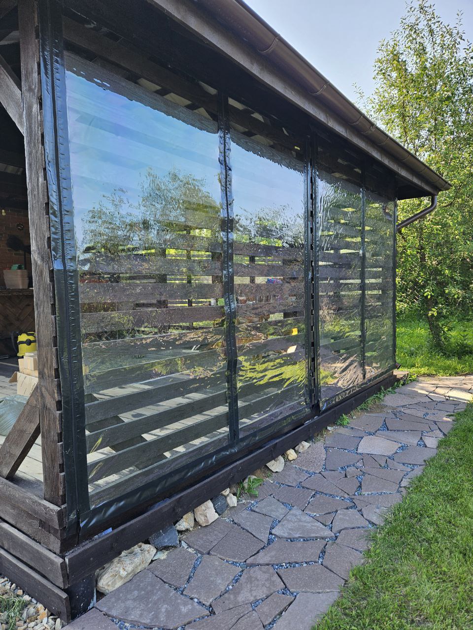 Мягкие окна для беседки имеют срок службы до 10 лет. ПВХ не выгорает и не трескается.